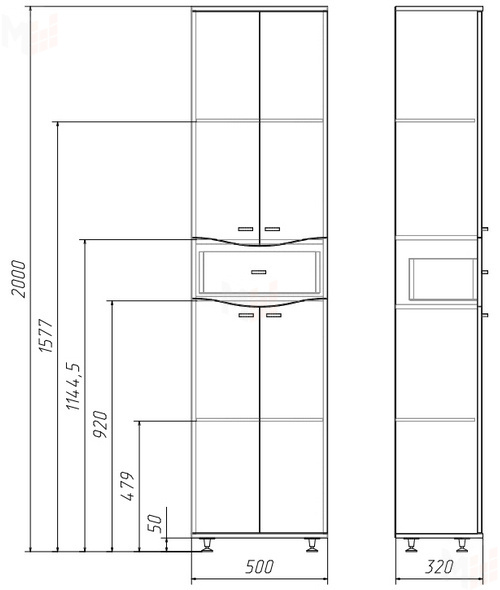 Особенностью пенала является наличие двух распашных дверей и одного верхнего ящика с доводчиками. Это обеспечивает плавное и бесшумное закрывание дверей.