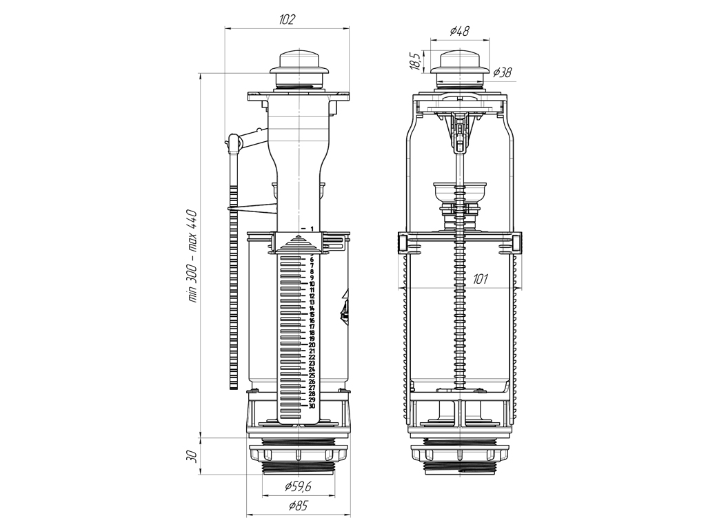 - Регулировка высоты в диапазоне 290-410 мм позволяет адаптировать механизм под разные модели бачков.