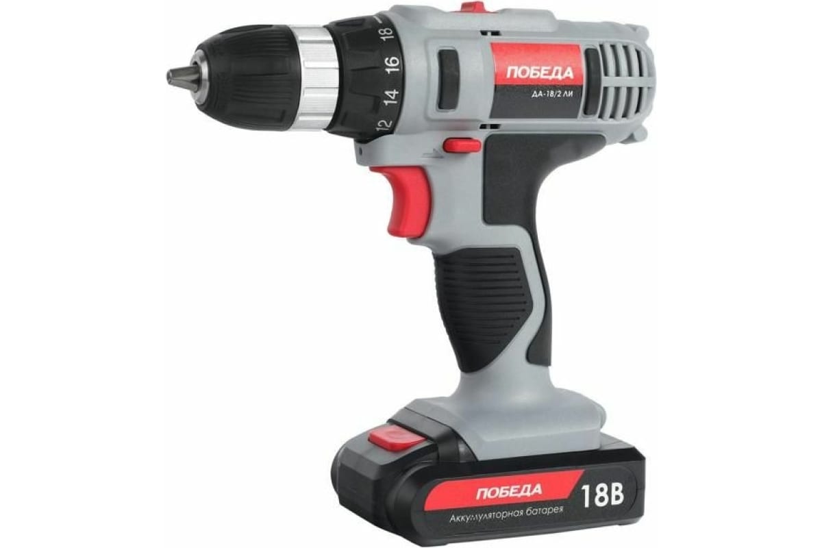 Аккумуляторная дрель-шуруповерт ПОБЕДА ДА-18/2 Ли 180201636 используется в монтажных и демонтажных работах.Обеспечивает работу с крепежными элементами и сверление отверстий в различных материалах.