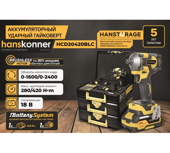 Гайковерт HCD20420BLC (18В, 1BatterySystem, 420Нм, 1/2", 2скор, кейс, ударн, б/щ) Hanskonner