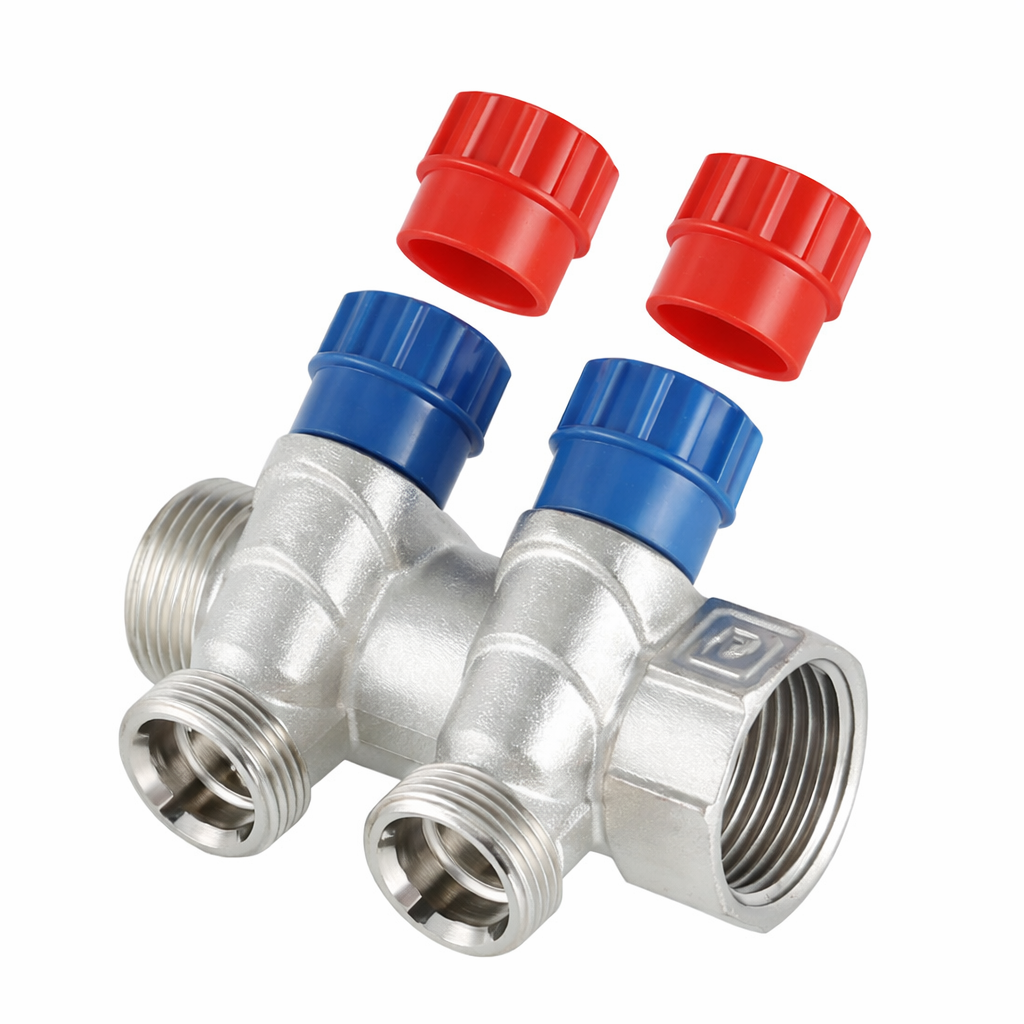 На каждом выходе установлен регулирующий вентиль, позволяющий выполнять балансировку системы и при необходимости полностью перекрывать отдельный контур. Конструкция обеспечивает надёжность, устойчивость к коррозии и удобство обслуживания. Средний ресурс работы вентилей — до 8 000 циклов открытия/закрытия.