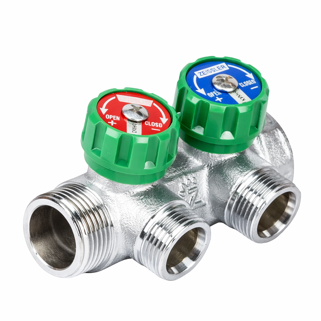 Коллектор с регулировочными вентилями 90 граудсов 2 вых. 1 х 3/4 Евроконус ZEISSLERКоллектор ZEISSLER предназначен для распределения и регулировки воды или теплоносителя в системах отопления и водоснабжения. Угловое исполнение 90 градусов обеспечивает удобный монтаж в коллекторных шкафах и при ограниченном пространстве.