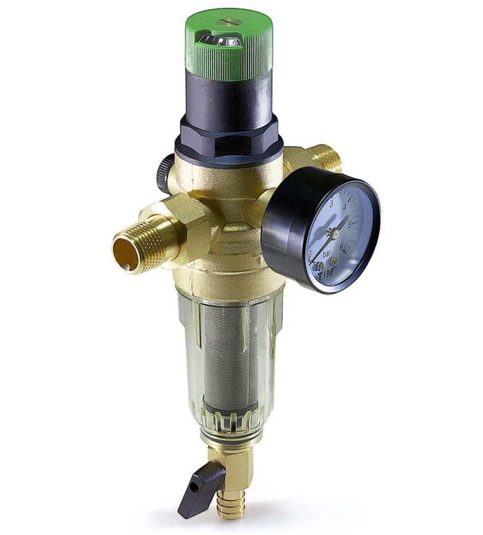Фильтр самоочищающийся промывной 3/4" с регулятором давления и манометром, для холодной воды прозрачный TIM