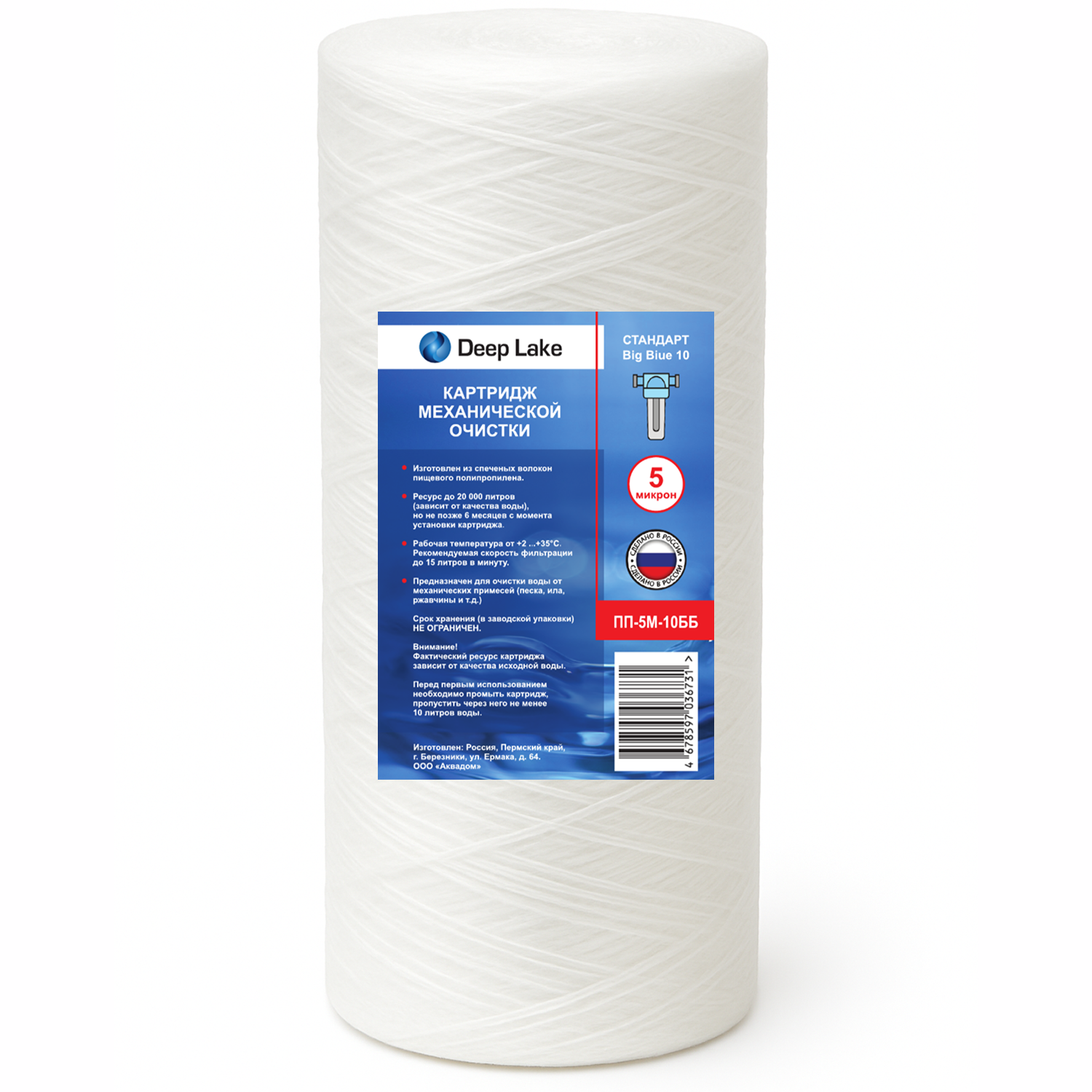 Картридж механической очистки Deep Lake ПП-5М-10ББ (5 микрон), Big Blue 10"Картридж Deep Lake ПП-5М-10ББ изготовлен из спечённых волокон пищевого полипропилена и предназначен для тонкой механической очистки воды. Он эффективно задерживает мелкие частицы — песок, ил, ржавчину и другие механические примеси, защищая сантехнику, бытовые приборы и последующие ступени фильтрации. Подходит для корпусов формата Big Blue 10".