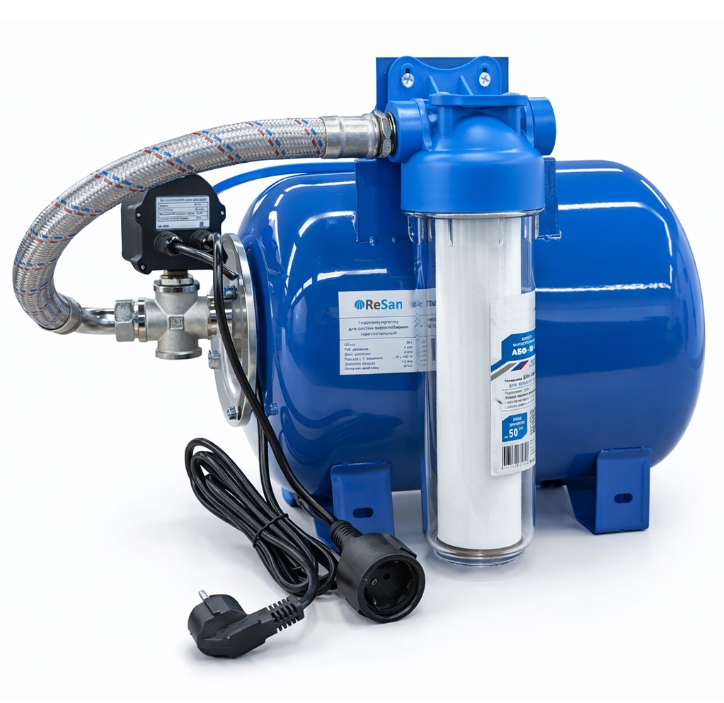 Встроенный фильтр предварительной очистки защищает насос и автоматику от механических примесей, а гидроаккумулятор снижает частоту включений насоса и повышает комфорт эксплуатации системы водоснабжения.