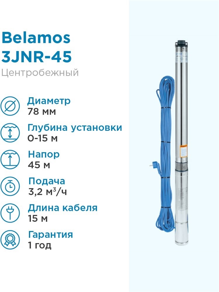 Насос скважинный погружной центробежный 3JNR-45/3 (3", 520Вт, 3200л/ч, 45м, 1") каб. 15м (до 30м) BELAMOS