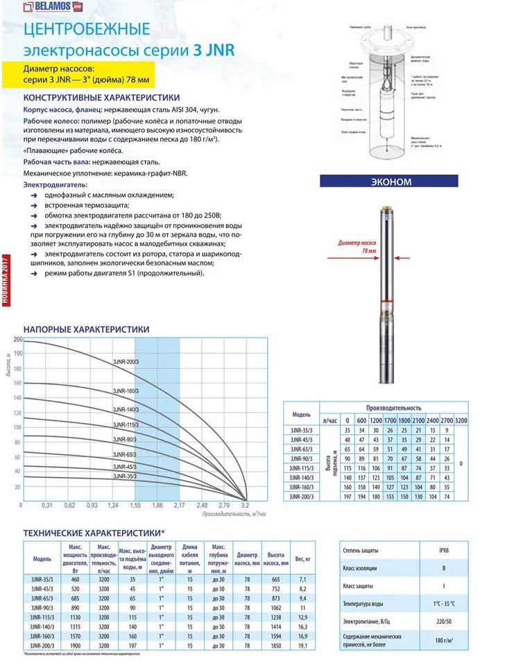 ?? Скважинный погружной насос Belamos 3JNR-65/3 разработан для высокоэффективной подачи чистой воды с большой глубины в жилищные объекты и для орошения сада. Устанавливается прямо в пробуренные скважины и применяется в автоматических системах водоснабжения дач, частных домов, коттеджей и других построек, не имеющих возможности подключения к центральной системе водоснабжения.?? Преимущества: