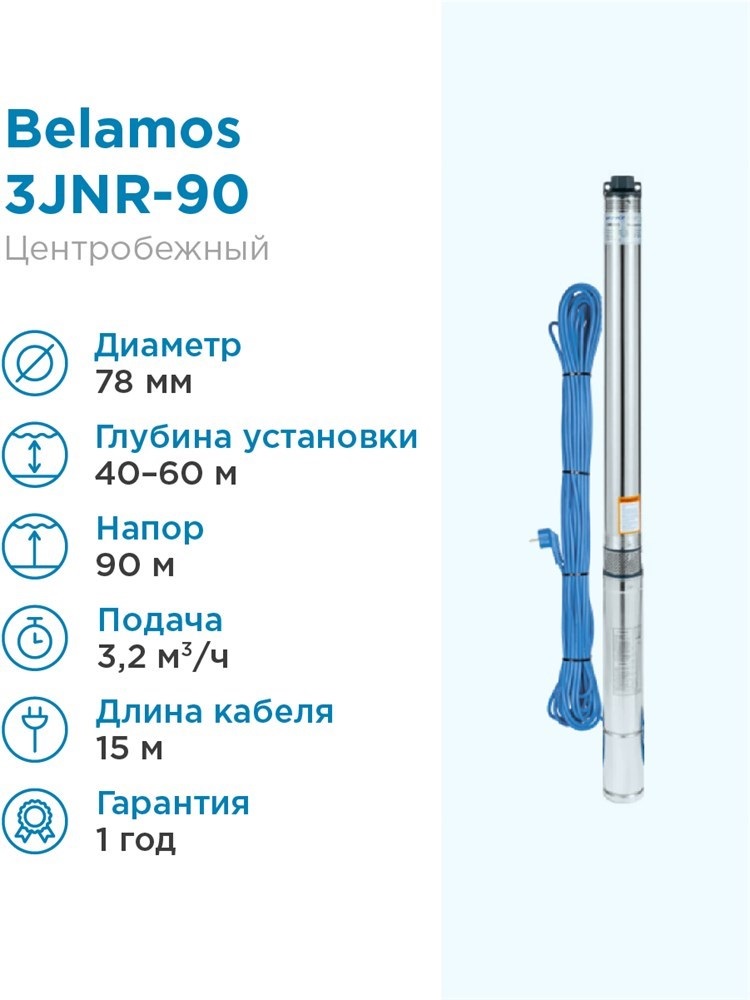 Насос скважинный погружной центробежный 3JNR-90/3 (3", 890Вт, 3200л/ч, 90м, 1") каб. 15м (до 30м) BELAMOS