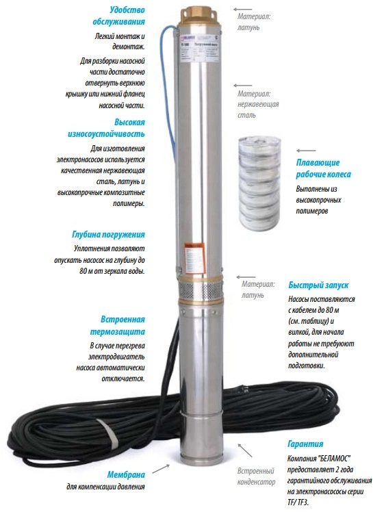 ?? Скважинный погружной насос Belamos TF3 -80 разработан для высокоэффективной подачи чистой воды с большой глубины в жилищные объекты и для орошения сада. Устанавливается прямо в пробуренные скважины и применяется в автоматических системах водоснабжения дач, частных домов, коттеджей и других построек, не имеющих возможности подключения к центральной системе водоснабжения.?? Преимущества: