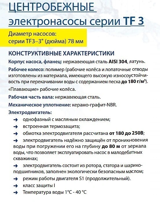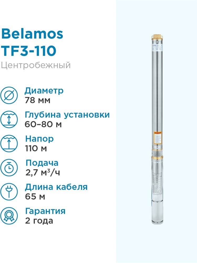 ?? Скважинный погружной насос Belamos TF3-110 разработан для высокоэффективной подачи чистой воды с большой глубины в жилищные объекты и для орошения сада. Устанавливается прямо в пробуренные скважины и применяется в автоматических системах водоснабжения дач, частных домов, коттеджей и других построек, не имеющих возможности подключения к центральной системе водоснабжения.?? Преимущества: