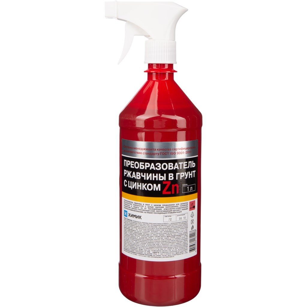 Преобразователь ржавчины ХИМИК с цинком,1 л, предназначен для обработки металлических поверхностей с целью удаления коррозионных поражений (ржавчины) и защиты их от последующих атмосферно-климатических воздействий.Состав образует грунтовочный слой, обеспечивающий адгезию с любыми лакокрасочными материалами. Не требует последующей промывки водой.