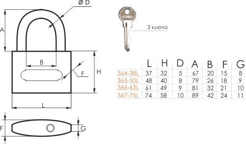 Замок навесной длинная дужка 367-75L (75мм) SOLLER