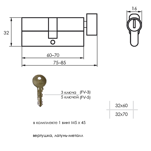 Механизм цилиндровый FV5 хром (60мм, 5 ключа) ключ/вертушка, латунь/металл SOLLER (12/120; 10702070/180319/0046002, КИТАЙ)