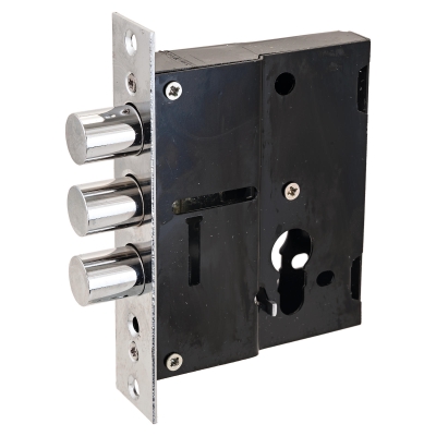 Замок врезной цилиндровый, без механизма секрета. Предназначен для установки в двери китайского производства, в качестве дополнительного замка.Три цилиндрических стальных хромированных ригеля, диаметр 17,5мм. Вылет ригелей 21мм. Стальной корпус. Удаление ключевого отверстия 60мм. Цвет торцевой планки - хром, ширина 30мм.