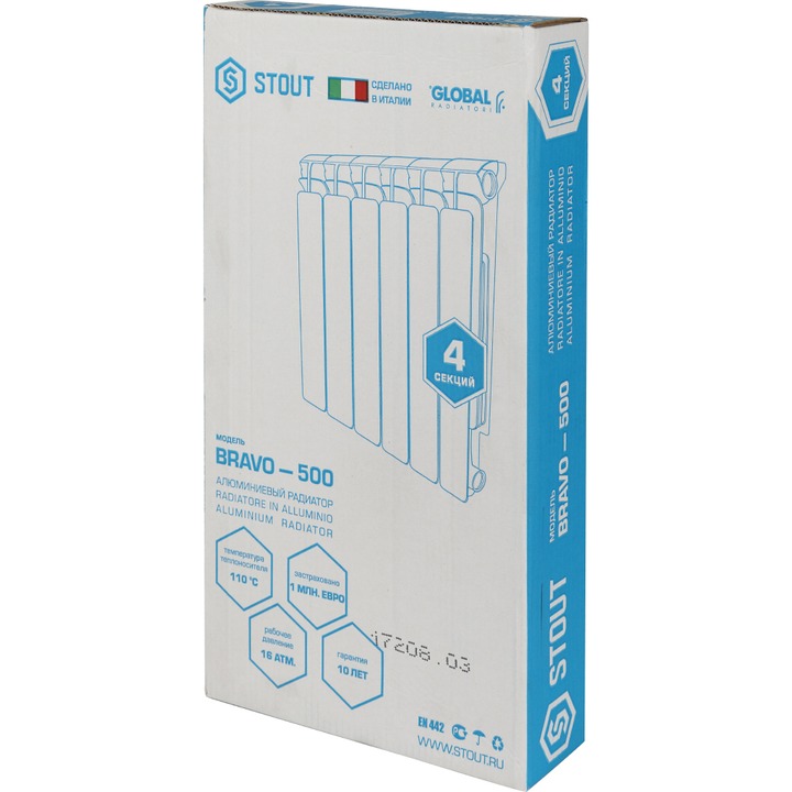 Радиаторы STOUT Bravo/Bravo Ventil собираются из отдельных секций, которые изготавливаются из качественного алюминиевого сплава методом литья под давлением. Наружная поверхность секции радиатора окрашена порошковой эмалью белого цвета (RAL 9010).Каждая секция представляет собой единый монолит из двух коллекторов и связывающего их оребрения,