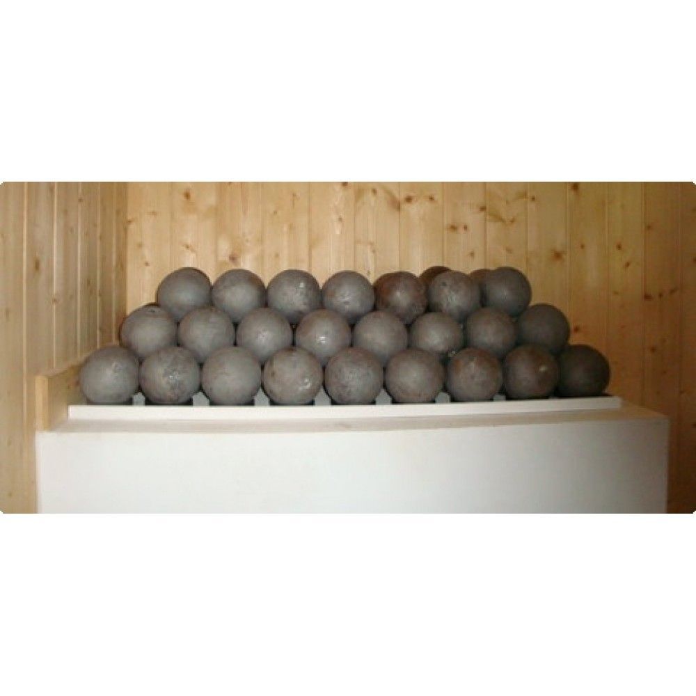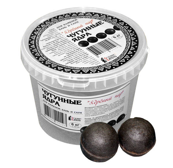 Чугунные ядра применялись для получения банного пара в военно-полевых условиях, отсюда и пошло выражение «Ядреный пар». Теплоемкость чугуна на 20% выше, чем у камня, а теплопроводность – больше в 30 раз. Поэтому чугунные ядра в каменке позволяют в несколько раз быстрее прогреть всю каменку и, соответственно, помещение парной. Чугунные ядра не трескаются и не рассыпаются при резких перепадах температур. Почему не рекомендуется использовать только чугунные ядра для заполнения всего пространства каменки? Пар от чугуна очень сухой и горячий. Чтобы сбалансировать его влажность и получить комфортный, мягкий, оздоровительный пар, используется смешанная закладка из чугунных ядер и камней для каменки. Инструкция к применению: Выложить чугунными ядрами дно каменки. На ядра рекомендуется уложить специальные природные камни для бань и саун (порфирит, дунит, хромит, нефрит и другие) в смеси с остатком чугунных ядер (отношение чугуна к камню должно быть ориентировочно 30/70 в пользу природного камня).