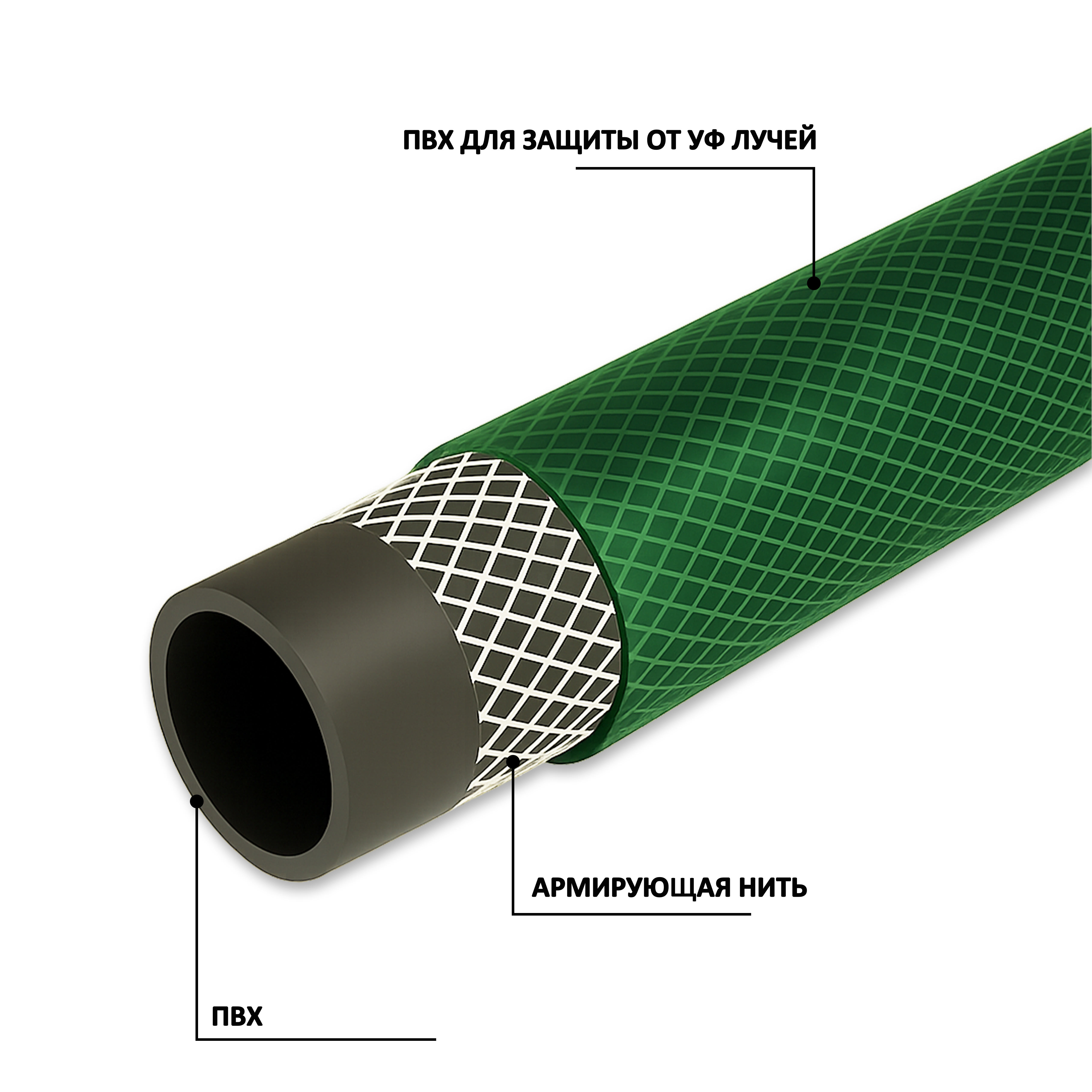 Внешний вид: внутренний слой черный, второй слой армировка белой синтетической нитью диагональным плетением, внешний слой прозрачный с зеленым оттенком.