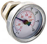 ) Термометр погружной предназначен для контроля текущей температуры теплоносителя в контурах теплого пола (место установки – коллекторные блоки, насосно-смесительные узлы), других систем водяного отопления либо охлаждения. Диапазон значений измеряемой величины – 0–80 °C. Класс точности прибора – 2. Диаметр циферблата – 41 мм. Материал корпуса термометра – оцинкованная сталь. Термометр имеет тыльное подключение, комплектуется выполненной из латуни CW614N погружной гильзой с наружной присоединительной резьбой 1/2" и уплотнением из EPDM, монтируемой с помощью гаечного ключа. Максимальное рабочее давление в обслуживаемой системе – 10 бар.Характеристики