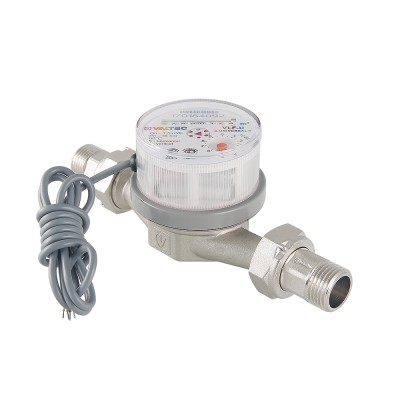 (VLF-15U-I) Водосчетчик универсальный – для измерения расхода холодной и горячей воды, главным образом – в квартирах. Условный диаметр модели – 1/2"; номинальный расход воды – 1,5 куб. м/ч. Длина прибора без сгонов – 80 мм. Резьба присоединительных патрубков – 3/4".Наличие импульсного выхода позволяет организовать дистанционное считывание показаний.