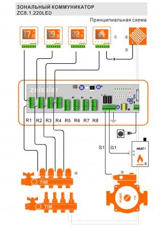Зональный коммуникатор на 8 каналов TIM ZC8.1.220LED представляет собой проводной коммутационный блок, который предназначен для управления исполнительными механизмами в системе отопления на основании информации от терморегуляторов.Принцип действия Термостаты подают сигналы (включить нагрев/отключить нагрев) на основании показаний своих датчиков температуры в контрольный центр, который в свою очередь подключает через реле своих потребителей.