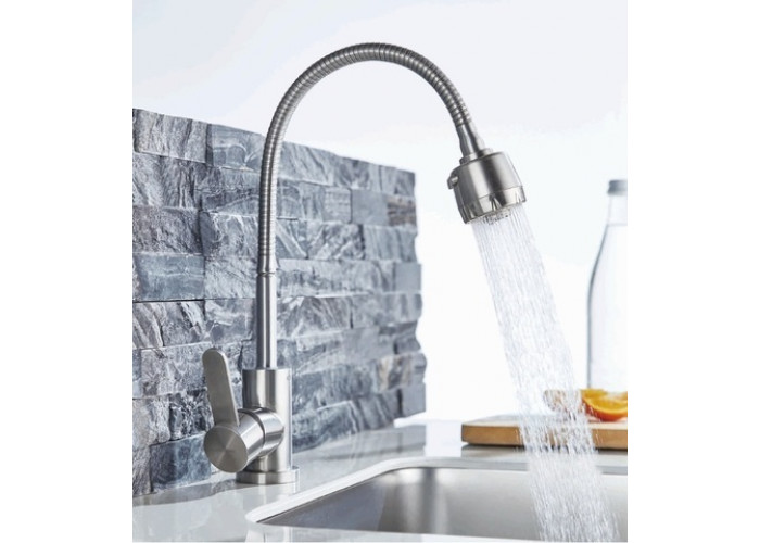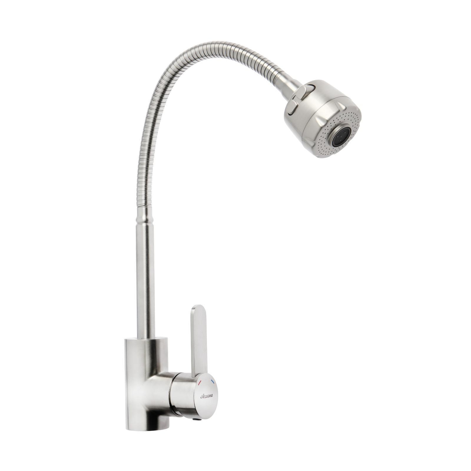 Смеситель для кухни Accoona оснащён высоким изливом и одним рычагом.Изделие позволяет набирать воду в большие ёмкости, мыть крупную посуду, а также и саму мойку.
