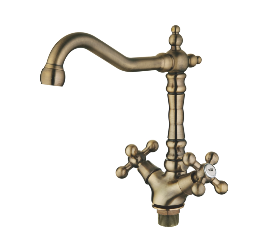 Смеситель для кухни Ассооnа А4571С выглядит очень стильно за счет ретро-дизайна, обеспеченного двухвентильным управлением и бронзового покрытия корпуса. Модель характеризуется довольно большой высотой излива, достигающей 147 мм. Для регулировки напора и температуры воды используются два вентиля: такая конструкция удобна для более точного настроя температуры воды. Кухонный смеситель оснащен аэратором – сеточкой на изливе, за счет которой вода смешивается с воздухом для ограничения потока.