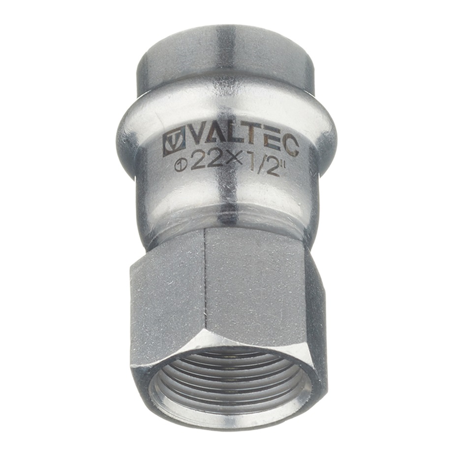 (VTi.902.I) Пресс-фитинг из нержавеющей стали с внутренней резьбой обеспечивает соединение тонкостенной стальной трубы с резьбовым элементом монтируемой системы. Область применения – трубопроводы водоснабжения, отопления, иные инженерные и технологические установки с рабочей температурой до 120 °С и давлением до 16 бар.Концевой переходник с внутренней резьбой VTi.902.l изготовлен из стали AISI 304. Материал уплотнения – эластомер EPDM. Отдельно можно приобрести уплотнительные кольца из FPM (витон); в этом случае максимальная рабочая температура увеличивается до 140 °С.