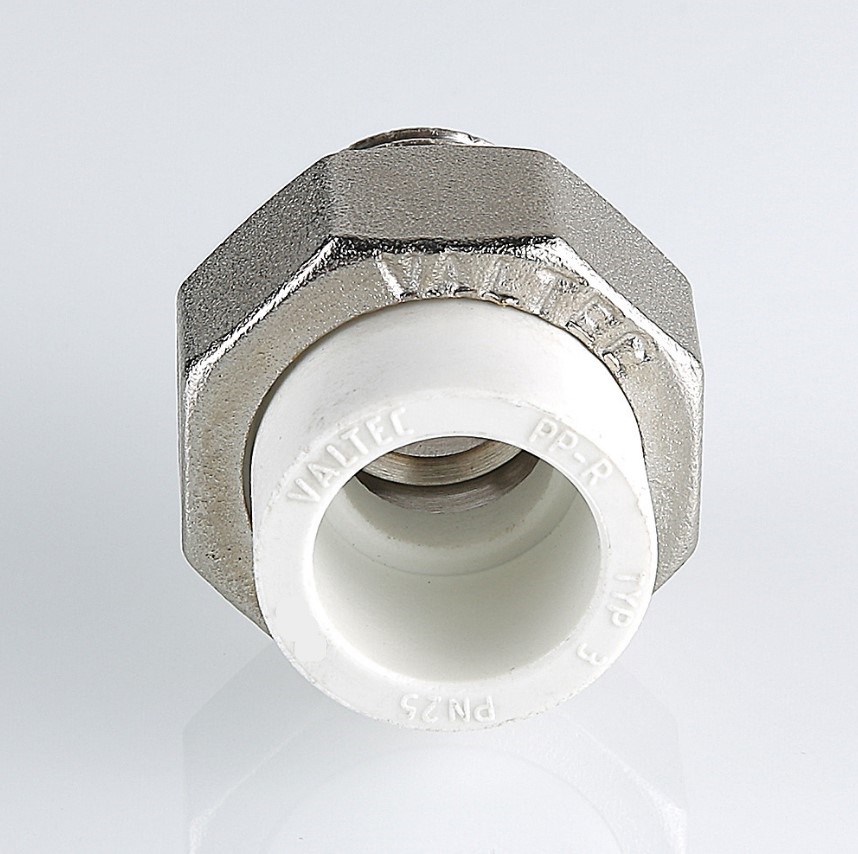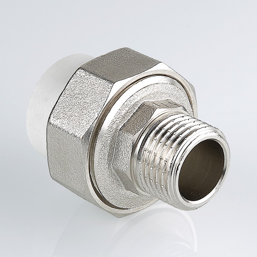 Разъемный полипропиленовый фитинг с переходом на наружную резьбу(VTp.761.0) Металлопластиковый фитинг для создания разъемного, с использованием накидной гайки, соединения полипропиленового трубопровода с трубопроводом или арматурой из других материалов. Уплотнительное кольцо выполнено из синтетического каучука EPDM. Резьба фитинга – наружняя трубная по ГОСТу 6357.