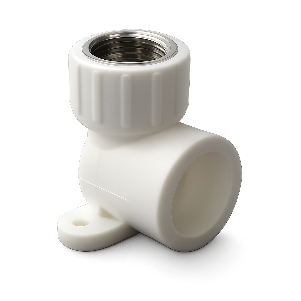 Угольник с внутренней резьбой и креплением используется для соединения под углом 90о иОдновременного крепления к вертикальной плоскости трубы PPR с резьбовым фитингом с наружной резьбой.