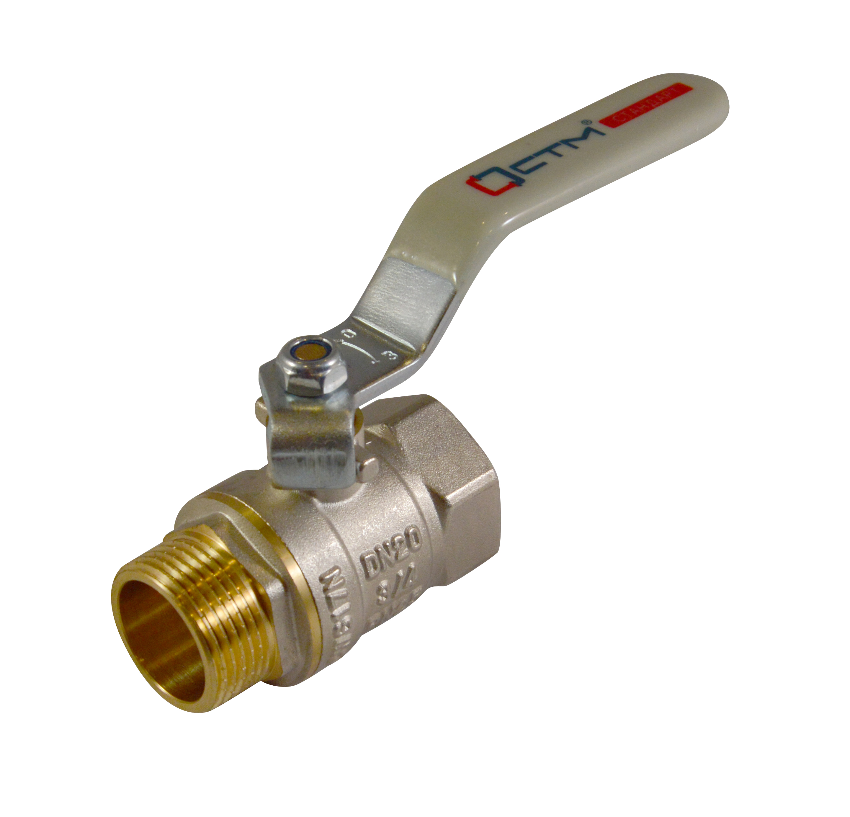 Кран шаровой для воды СТМ с внутренней и наружной резьбой, стальная ручка-рычаг в серой полимерной оболочке.Материал: латунь с никелированным покрытием
